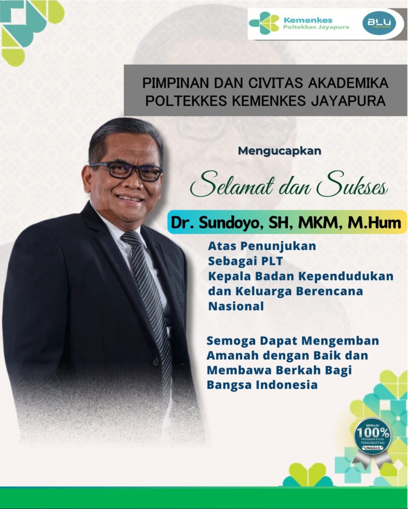 Segenap Pimpinan dan Civitas Akademika Poltekkes Kemenkes Jayapura mengucapkan Selamat dan Sukses kepada Bpk. Dr. Sundoyo, SH, MKM, M.Hum atas Penunjukan sebagai PLT Kepala Badan Kependudukan dan Keluarga Berencana Nasional.