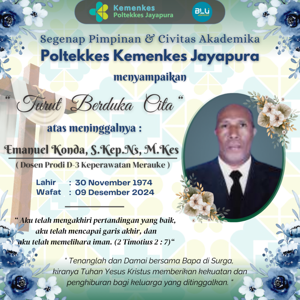 Segenap Pimpinan beserta Civitas Akademika Poltekkes Kemenkes Jayapura menyampaikan “TURUT BERDUKA CITA” atas Terpanggilnya Bpk. Emanuel Konda, S.Kep.Ns, M.Kes. Almarhum semasa hidupnya adalah sebagai Pegawai Negeri Sipil di lingkungan Poltekkes