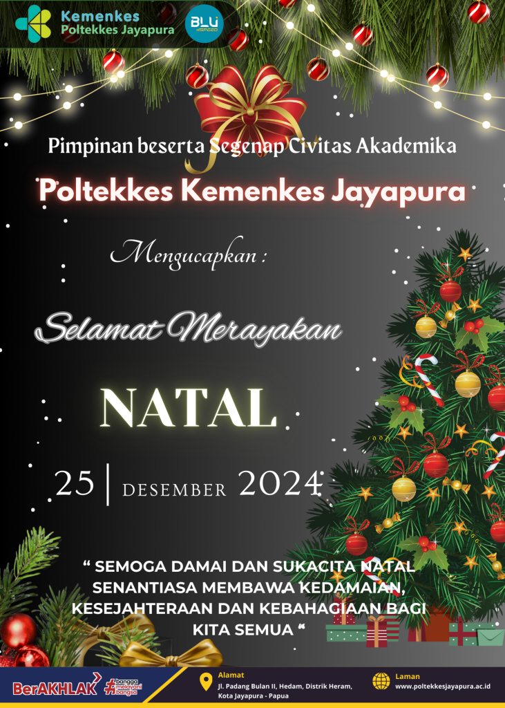 Pimpinan beserta Segenap Civitas Akademika POLTEKKES KEMENKES JAYAPURA mengucapkan “SELAMAT MERAYAKAN HARI NATAL” 25 Desember 2024, bagi yang merayakan Natal. “ Semoga Damai dan Sukacita Natal Senantiasa Membawa Kedamaian, Kesejahteraan