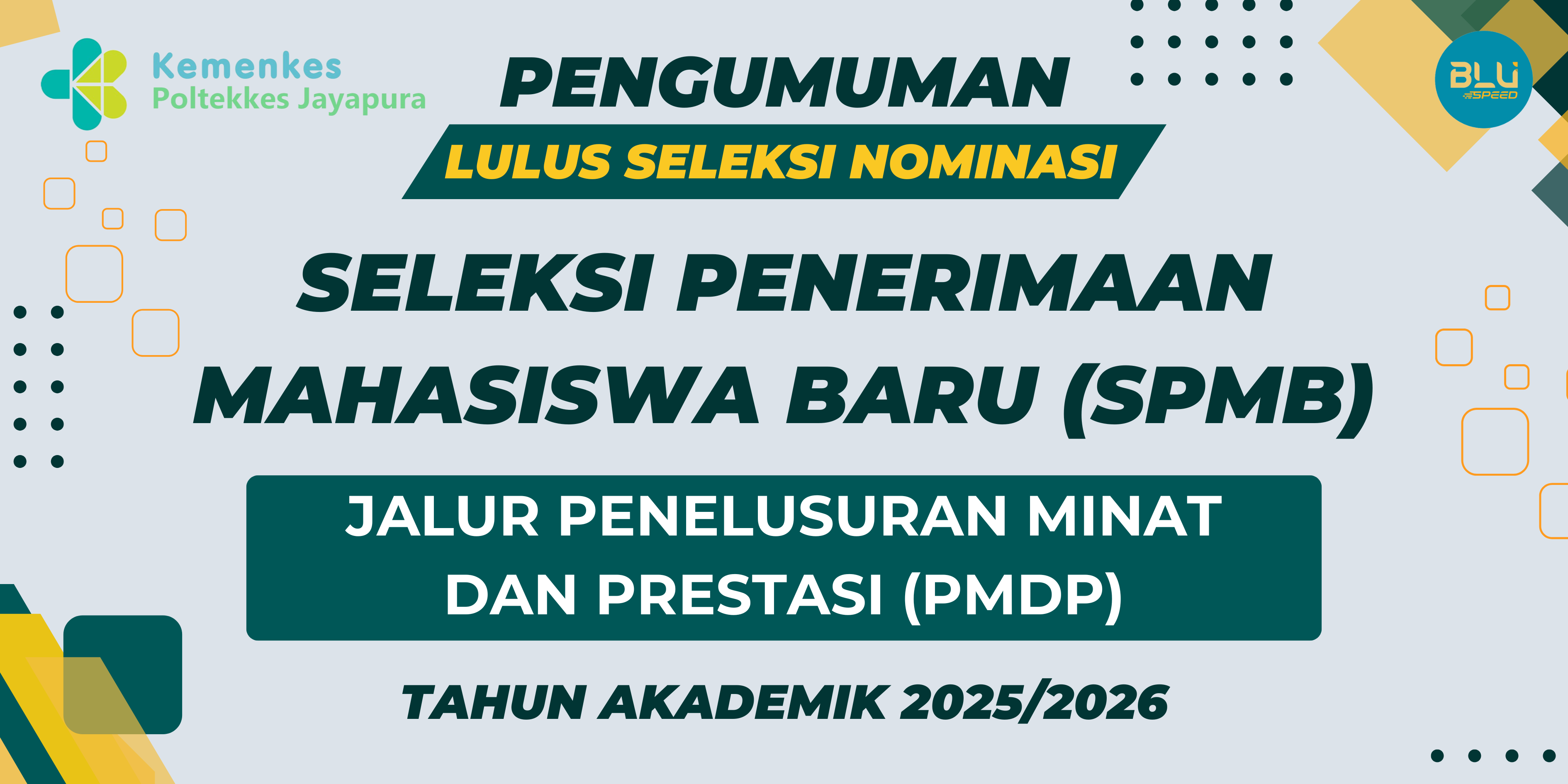 Berdasarkan pengumuman Panitia Seleksi Penerimaan Mahasiswa Baru (SPMB) Jalur Penelusuran Minat dan Prestasi (PMDP) Poltekkes Kemenkes Jayapura Tahun Akademik 2025/2026, kami Pimpinan dan Seluruh Civitas Akademika Poltekkes Kemenkes Jayapura mengucapkan selamat atas Saudara/i yang dinyatakan LULUS.