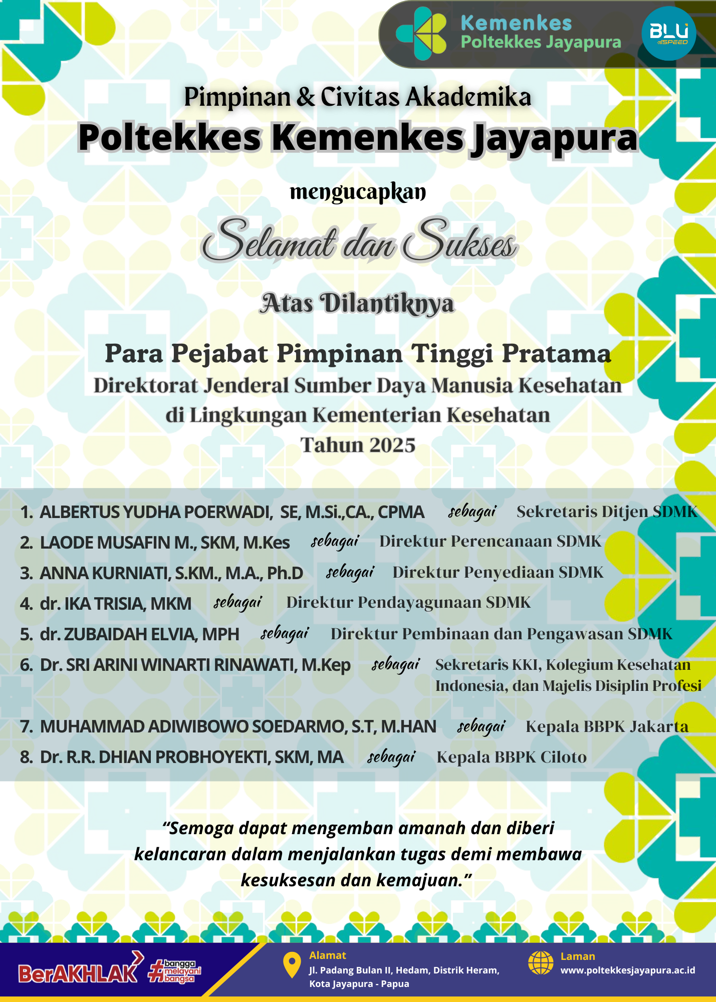 Pimpinan beserta Segenap Civitas Akademika POLTEKKES KEMENKES JAYAPURA mengucapkan “Selamat & Sukses atas Dilantiknya Para Pejabat Pimpinan Tinggi Pratama – Direktorat Jenderal Sumber Daya Manusia Kesehatan di Lingkungan Kemenkes RI | Tahun 2025.”